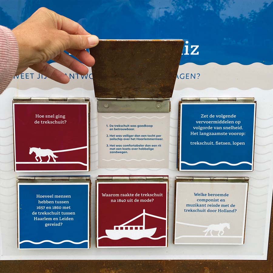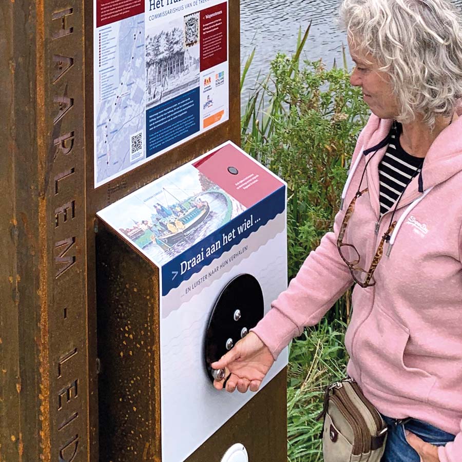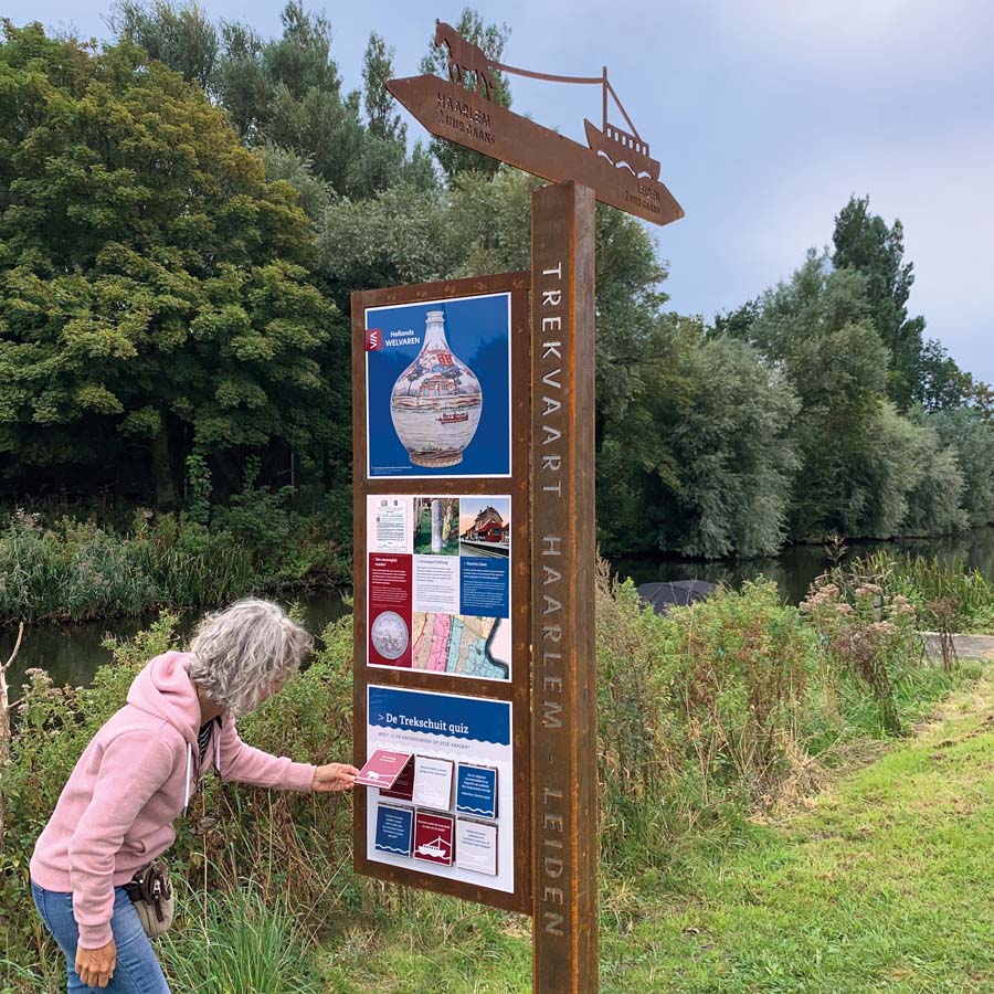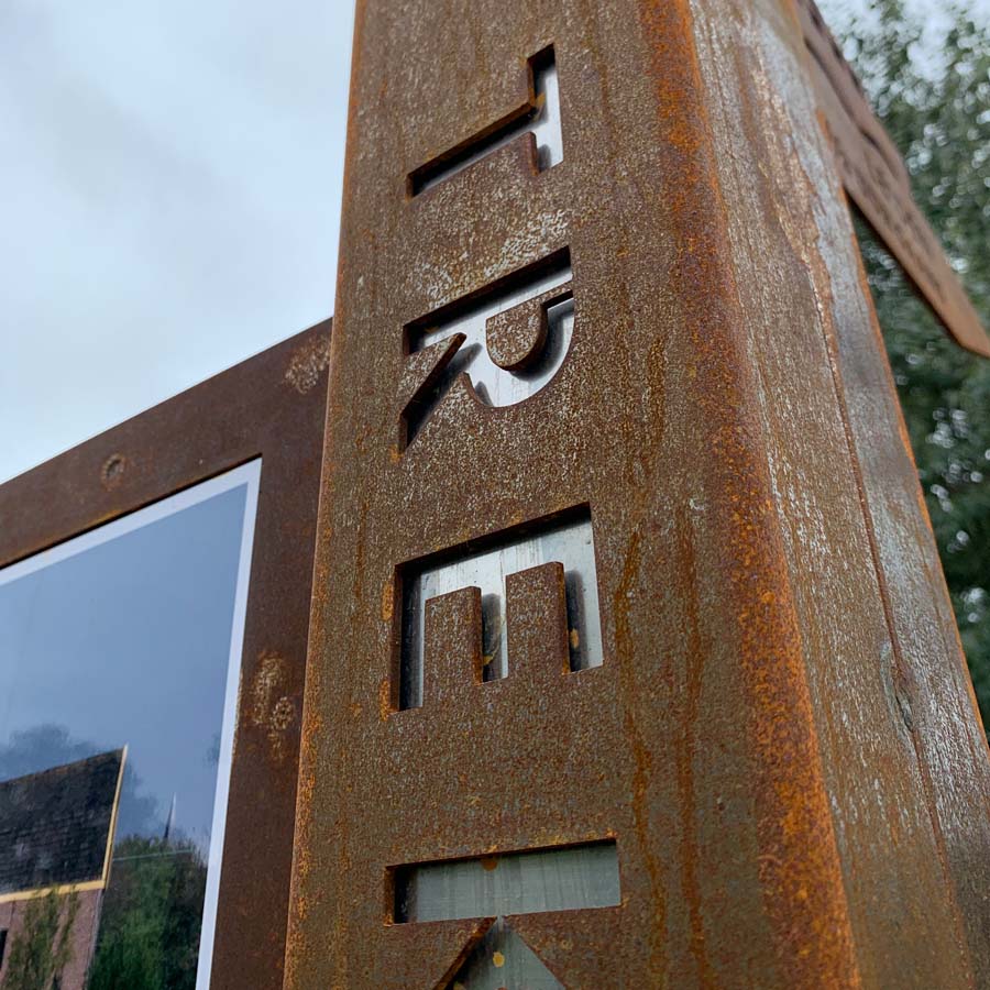 Nostalgische wegwijzer uit Cortenstaal in combinatie met sublimatiepanelen en verschillende beleefobjecten. Zo wordt de informatie voor jong tot oud toegankelijk gemaakt.– In samenwerking met Buro Kloeg –